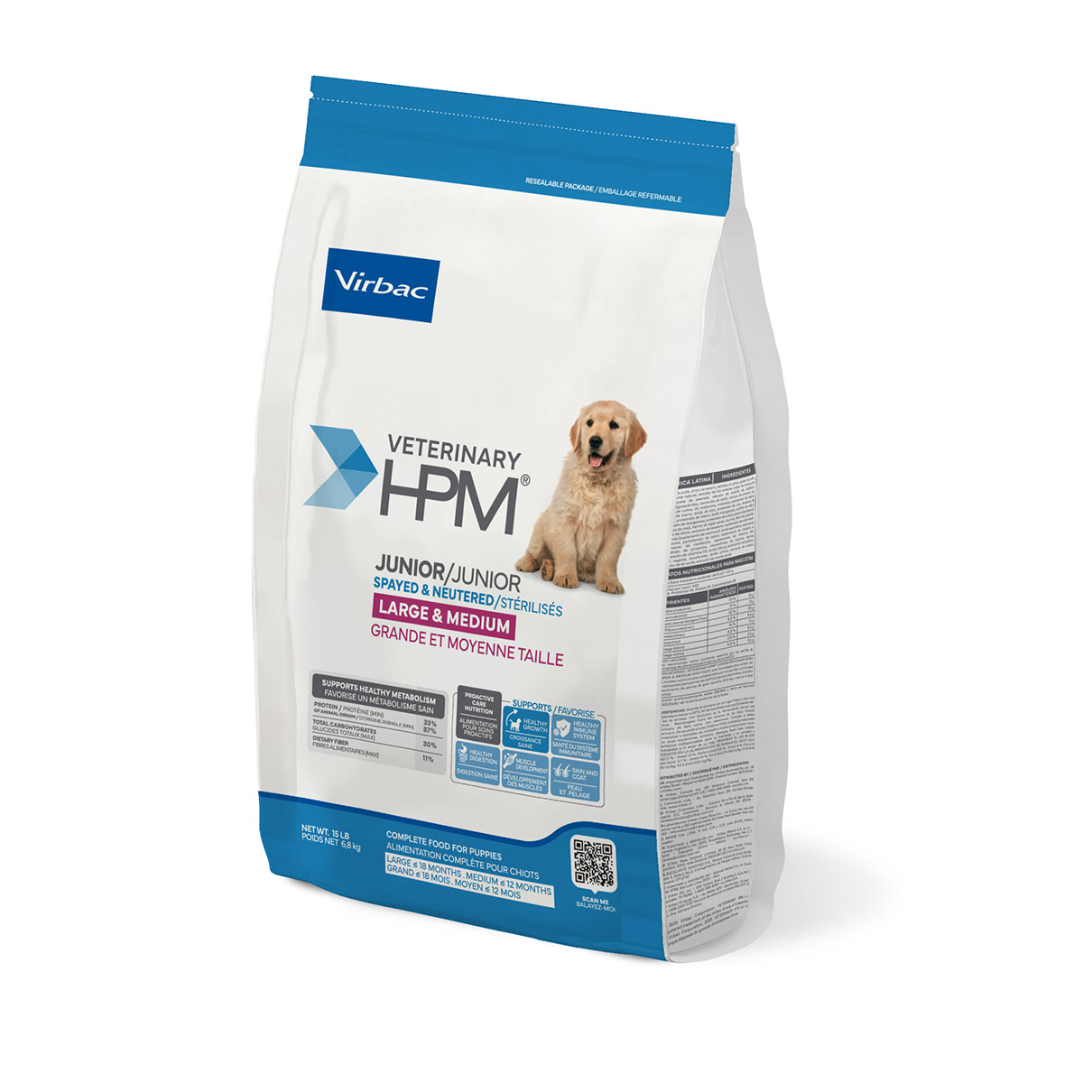 VETERINARY HPM® Spay & Neuter Diets are designed to support the health of your spayed or neutered Large or Medium Breed puppies that still requires nutrients for growth. The energy delivered through these Diets focuses on protein, with a moderate fat contribution and minimal carbohydrates. This macronutrient profile, in addition to a purposeful blend of soluble and insoluble fibers, supports pet satiety while delivering an appropriate caloric density for spayed and neutered pets.